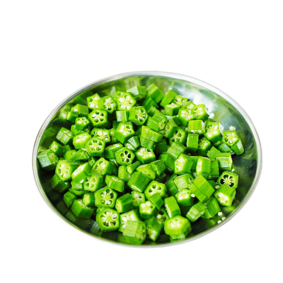 Quiabo orgânico cortado em pedaços, congelado, embalado em pacote de 1kg.